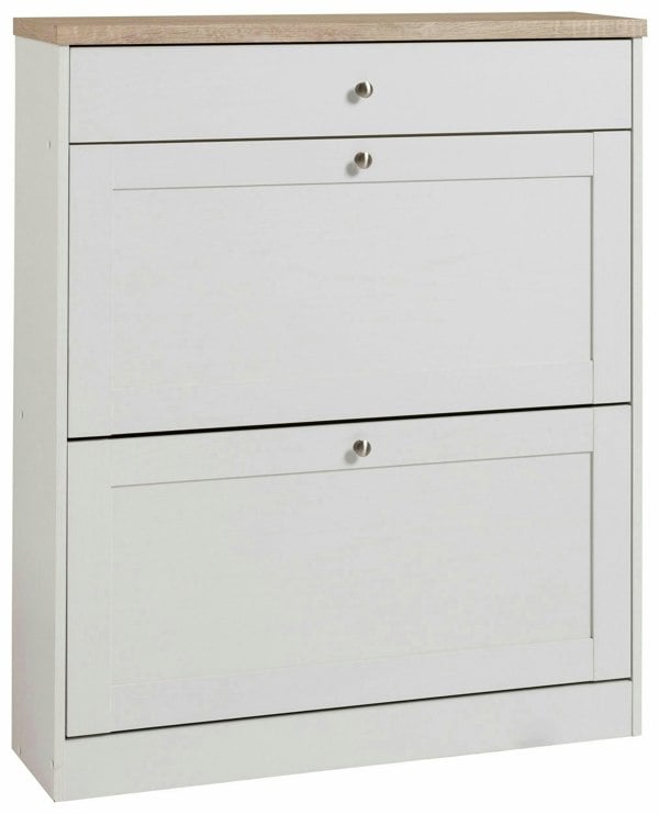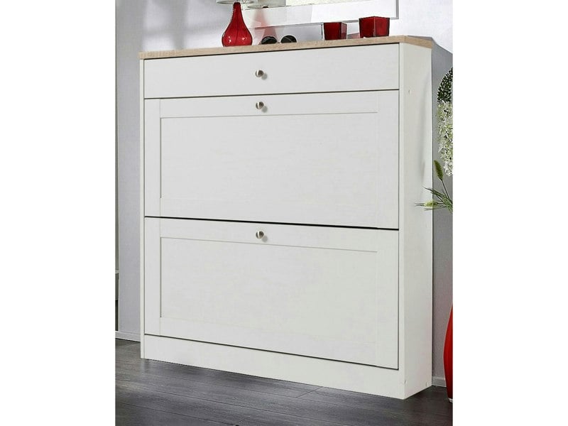 Add a stylish touch to your entry with this practical shoe chest. Its design harmonizes with both industrial and country house style interiors. The chest is made of highquality FSCcertified particle board. It has an easycare surface and a sturdy build. The two flip drawers provide enough space for multiple shoes. A small drawer is perfect for storing essential items. The shoe chest can be assembled easily with the included hardware bag. With its timeless design this chest fits in with all furnishing concepts and living styles.