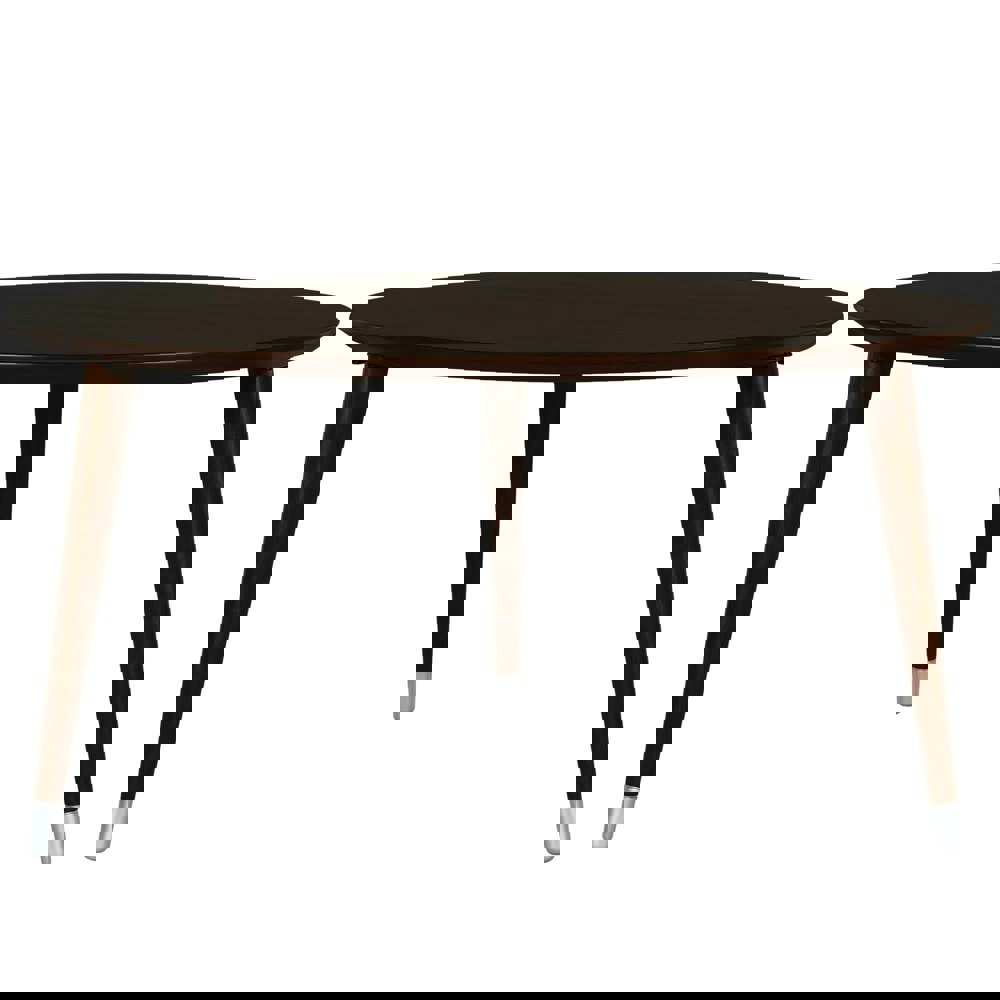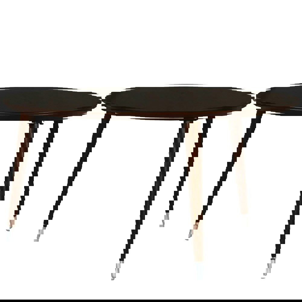 Bring some mid-century style to your living room with the Novogratz Kennington Coffee Table. The rich espresso wood veneer finish on the sturdy MDF gives the look of real wood for an affordable price. The large round table top provides plenty of space for remotes, cell phones, coasters and decorations. The rounded edging and spindle legs with painted endcaps add to the mid-century charm and create a beautiful conversation piece for your living room. Complete your room with the Kennington End Table for a balanced look. The Coffee Table ships flat to your door and requires assembly upon opening. Two adults are recommended for assembly. Once assembled, the Coffee Table measures to be 18. 125”H x 35. 375”W x 35. 375”D.