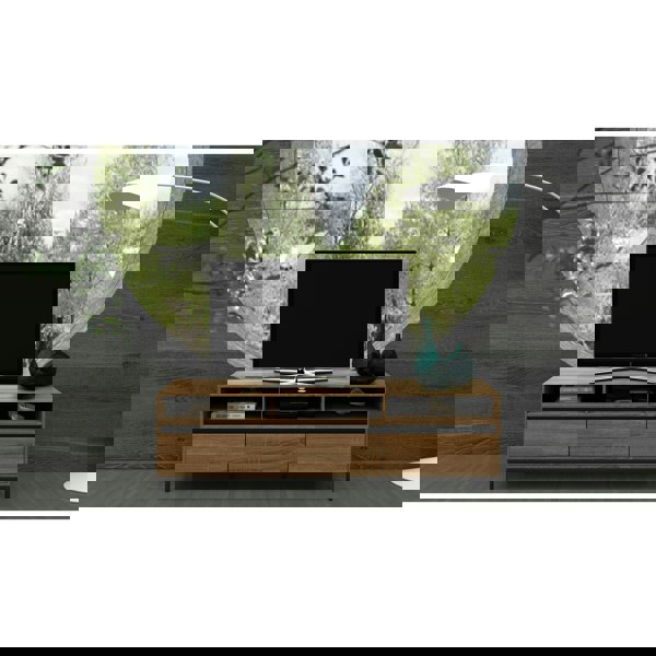 This TV stand offers plenty of contemporary flair and storage potential within a compact build ideal for smaller spaces. The twotone or onetone color palette and streamlined silhouette add a touch of modern design to any room while two shelves and a cabinet provide plenty of storage space for a media library electronics and more. A cable management system helps keep everything tidy.