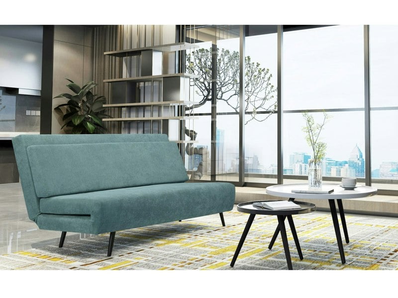 It functions as both a compact sofa and converts into a bed, making it suitable for smaller spaces.