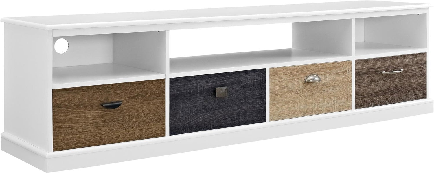 Spruce up your living room with the Mercer TV Console with Multicolored Drawer Fronts. Featuring 4 drawers that are each finished in a different woodgrain and color, this unique TV Console will be the centerpiece of your room. The drawer fronts also feature 4 different knobs that are interchangeable for a one of a kind design, or change the order of the drawer fronts for even more creative control. This TV Console accommodates up to a 65” flat screen TV with a maximum weight of 120 lbs. The concealed drawers and open cubbies allow you to store all your entertainment components in one spot. The classic white finish paired with the multicolored drawer fronts make this TV Console more than just a place to keep your belongings, it’s a conversation starter.
