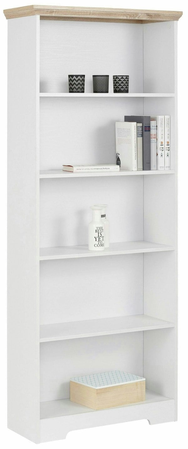 Enhance your workspace with a beautiful country house style bookcase that adds a touch of charm to any room. . Made from FSC-certified particle board, ensuring an easy-care surface and a sturdy build. . Features 4 fixed shelves providing plenty of space for books, decorations, and memorabilia. Maximum load capacity of 20 kg per shelf. . Timeless design that effortlessly blends with all existing décor styles, making it a perfect fit for any room.