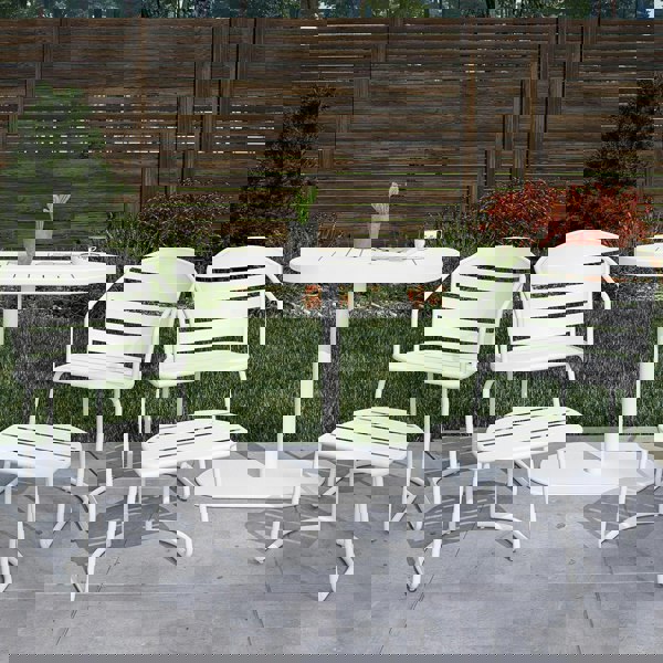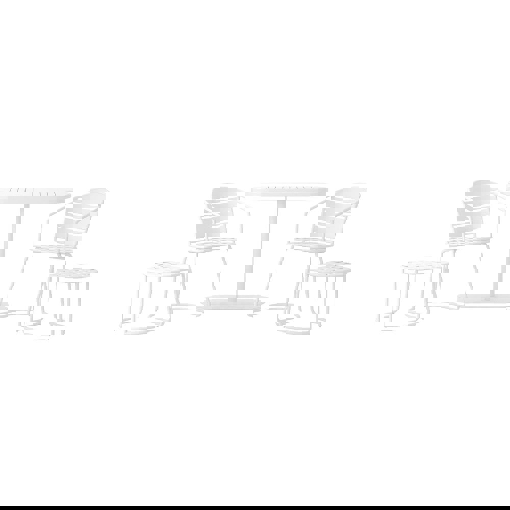 Our 5 piece Metro Retro nesting bistro steel patio furniture set is perfect for the apartment dweller with cozy outdoor spaces. Two lovely slat-back arm chairs, 2 outdoor ottomans and an oval pedestal-style slat-topped table fit comfortably in your small space. When not in use, all 5 pieces slide together and nestle in like puzzle pieces. Your small space may be maximized with this versatile outdoor set.