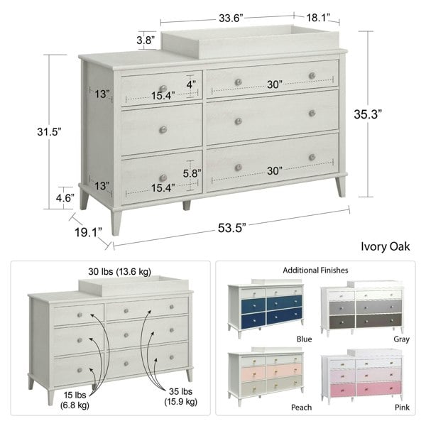 Keep your changing table for longer with the convertible Little Seeds Monarch Hill Poppy 6 Drawer Changing Table. Made of laminated particleboard, the classic chassis is accented by the ombre-styled drawer fronts for a fun look. Two sets of drawer knobs are included so you can customize the look of the Changing Table. The durable metal drawer slides feature built-in stops for safety. The changing table topper fits a standard-size changing pad (not included) and can be removed when your child outgrows it to convert the changing table into a youth dresser. Place all of your diapers, wipes, and lotions in the 6 spacious drawers to keep your changing essentials organized and out of sight.