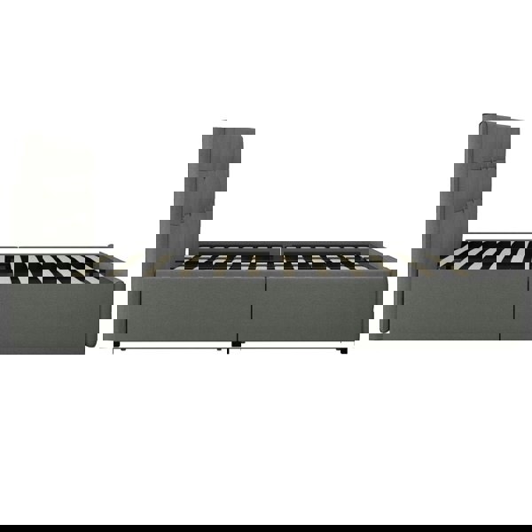 Simple and elegant, the Rose Upholstered Bed with Storage will make a lasting impression in your room. With a modern look and a touch of mid-century style, this bed combines fashion and function. On the one hand, it is upholstered in linen featuring button-tufted details in foam padding in both the headboard and footboard. On the other hand, it comes with drawers that provide extra storage space for your bed sheets, season clothing and accessories.