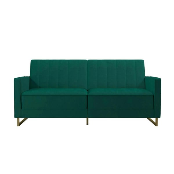The Novogratz Skylar Coil Sofa Bed stands out from the rest and makes a statement! Modern and trendy, the Sofa Bed is designed with a ribbed tufted cushioned back that features vertical stitching details in the backrest. The Skylar is upholstered in rich velvet and sits on trendy gold powder coated metal legs to add a touch of modern glam to your room décor. This upholstered Sofa Bed is constructed with pocket coil seating to offer optimal comfort for you and your guests during a movie night. This versatile Sofa Bed is also the perfect solution for accommodating overnight guests as its multi-functional split-back design allows you to independently recline the backrest between three positions: sitting, lounging and sleeping. Available in a variety of colors, the Novogratz Skylar Coil Sofa Bed is a great option if you want a piece that will instantaneously add functionality and personality to your home. What are you waiting for?