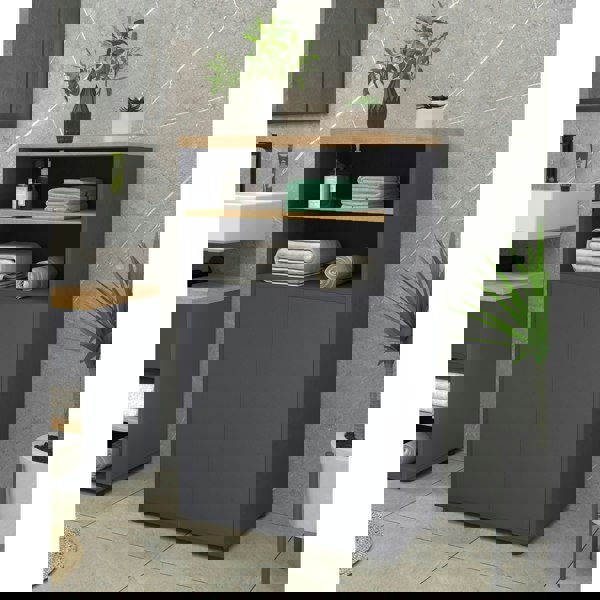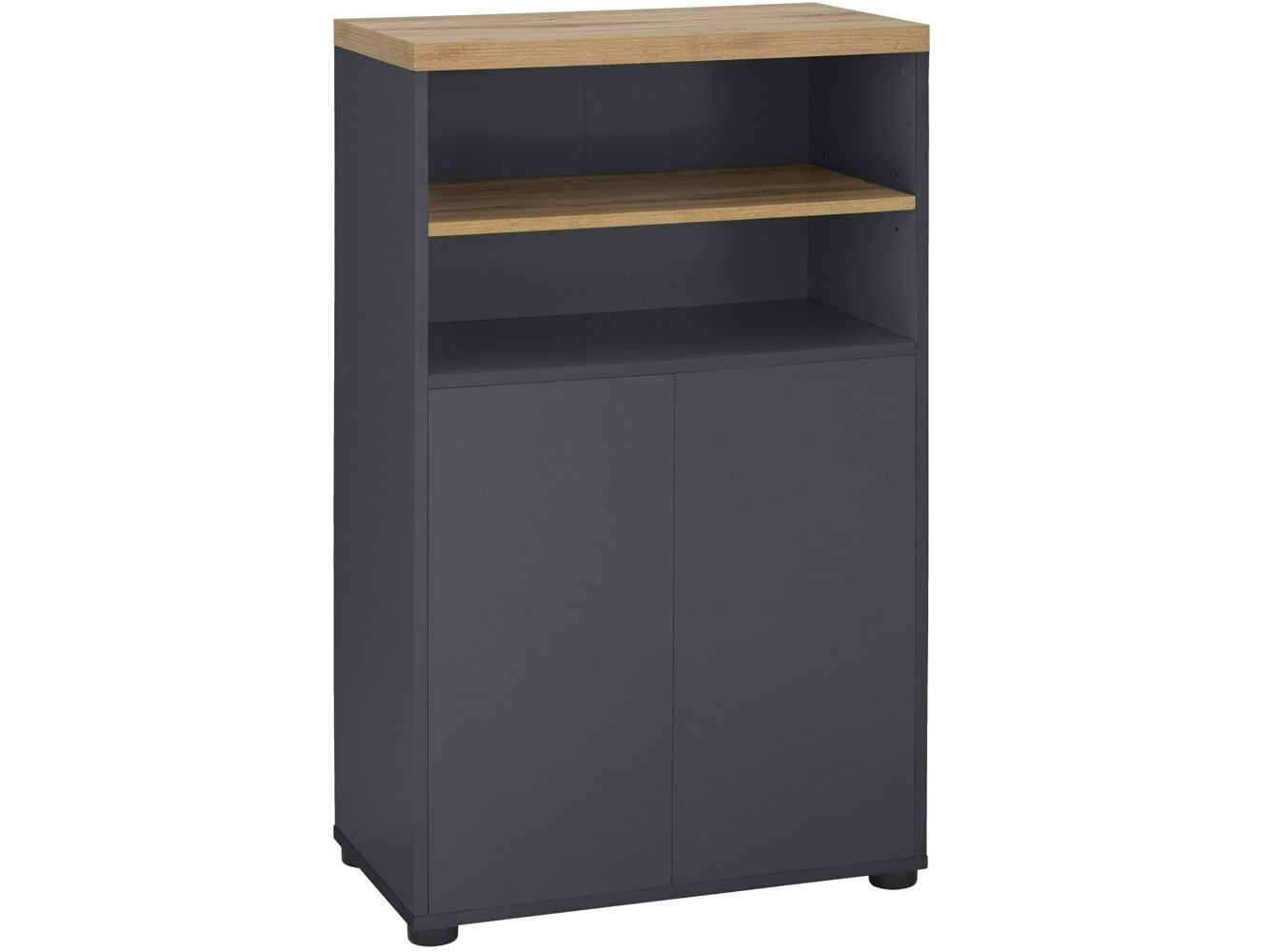 This cabinet with a pushtoopen function is a decorative highlight in any room. It is characterized by a modern design and decorated with beautiful elements in wood look. Integrated compartments provide practical storage potential. It also can be perfectly matched to your existing furnishing concept and harmonizes with different living styles. With easycare surface the cabinet is easy to clean. The material for assembly is included so that it can be assembled and set up quickly.