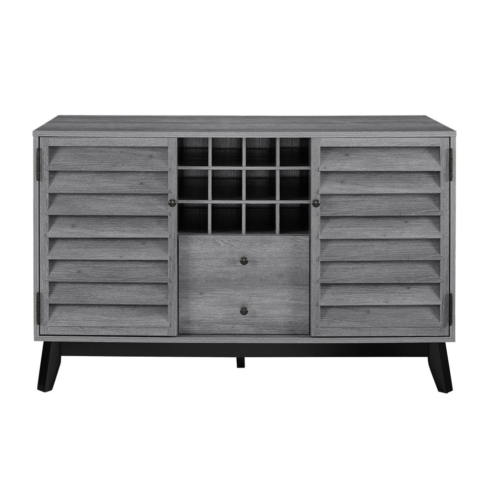 Bring the party to your dining room or living room with the Ameriwood Home Vaughn Wine Cabinet. This Wine Cabinet features multiple different types of storage with its 12 bottle cubbies, 1 drawer and 4 shelves. You can keep anything from your favorite wines, wine glasses and bottle openers in this Wine Cabinet for a one-stop-shop to a good time. The 4 shelves (2 adjustable) are behind louvered doors to keep your items out of sight but still right where you need them. The single drawer gives the illusion of 2 drawers with its double knobs and grooved drawer front but offers a deeper space to keep items. The mid-century look of this Wine Cabinet is made with laminated particleboard, MDF, wood veneer and solid wood for a strong build that will last for years and is finished in grey weathered oak or walnut.