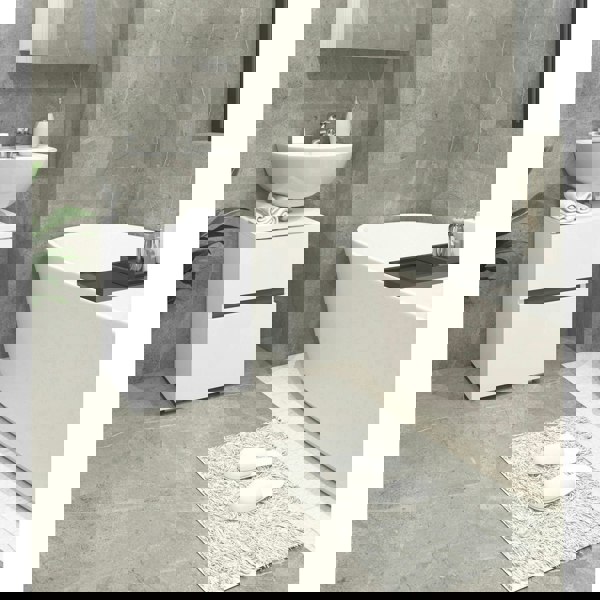 The small vanity unit without handles is functional and chic at the same time. The minimal design allows for the item to be incorporated into your existing interior. Thanks to the siphon cutout the cabinet can be placed under the washbasin to save space. It offers storage space for cleaning utensils and more. The bathroom cabinet is made in FSCÂcertified quality and has melaminecoated easycare surfaces. The revolving door is equipped with a convenient pushtoopen function. Available in more colors.