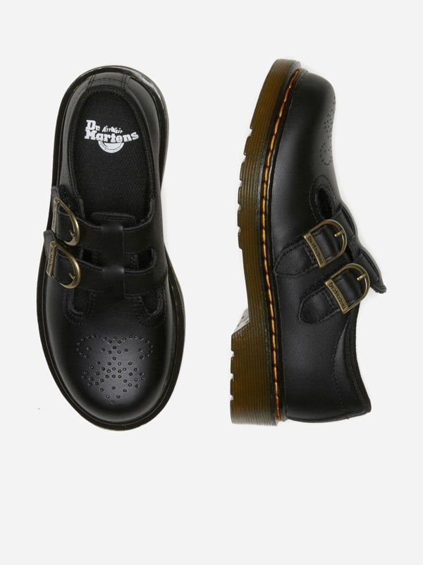 These Dr. Martens 8065 Mary Jane shoes for girls come in black with a classic silhouette and signature yellow stitching. The upper uses Softy T leather, a lightweight full-grain leather with a soft, supple feel and a fine embossed haircell pattern. Two adjustable straps secure the fit, while the flexible edition of the brand’s air-cushioned sole is finished with a flexible cemented sole construction.