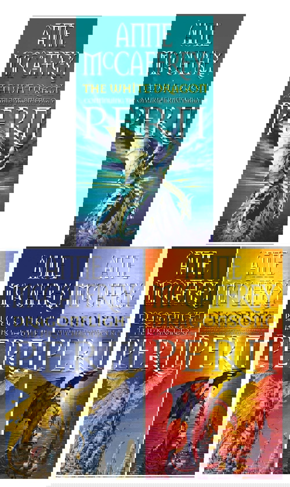Dragonriders of Pern is a three-book collection set by Anne McCaffrey, bringing together Dragonflight, The White Dragon and Dragonsong. Set on Pern, these stories centre on dragons and the people connected to them, against the backdrop of a recurring threat from space.