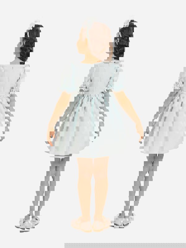 This baby girls dress set from Dress & Fleur pairs a sophisticated dress with a matching headband. The dress comes in blue jacquard with puff sleeves and lace trims, finished with pearl-button details for a refined look. A removable teddy bear accessory adds an extra decorative touch, with lace detailing and a sparkling crown.