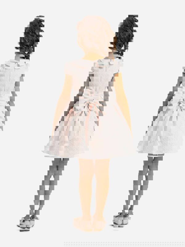 Dress & Fleur baby girls dress with headband in pink. This two-piece set includes a dress and a matching hairband, finished with textured jacquard material and a Peter Pan collar. Pearl-accented detailing and a delicate bow at the waist complete the look, while a zip fastening at the back keeps the finish neat.