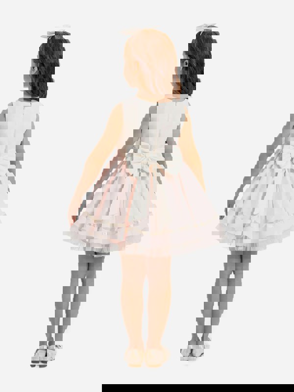 The skirt uses layered tulle for added volume, while satin bows sit at the waist and at the back. The dress is made with a polyester main and a cotton lining.