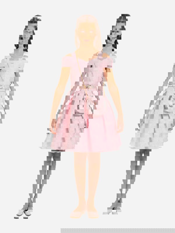 Dress & Fleur combine traditional abstracts with innovative materials for a sophisticated twist. This girls dress in pink comes with a matching belt and shoulder bag, bringing the label’s passion for exquisite pieces into a coordinated set.