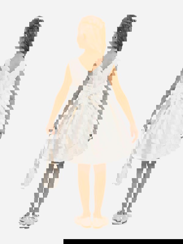This girls dress and matching bag set from Dress & Fleur comes in white, combining traditional abstract influences with innovative materials. The dress uses premium jacquard fabric with subtle texture and shimmering accents, finished with an oversized 3D floral appliqué on the bodice. Delicate beads and pearls add detail, while the pleated skirt completes the silhouette.