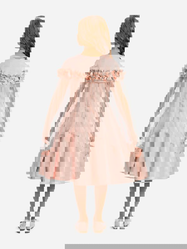 This girls dress from Dress & Fleur comes in pink satin fabric with a clean, tailored shape. A flared skirt is finished with a soft tulle hem, while floral appliqués sit on the shoulders. Ethereal tulle draping adds texture through the upper body, and a removable cape offers an alternative look.