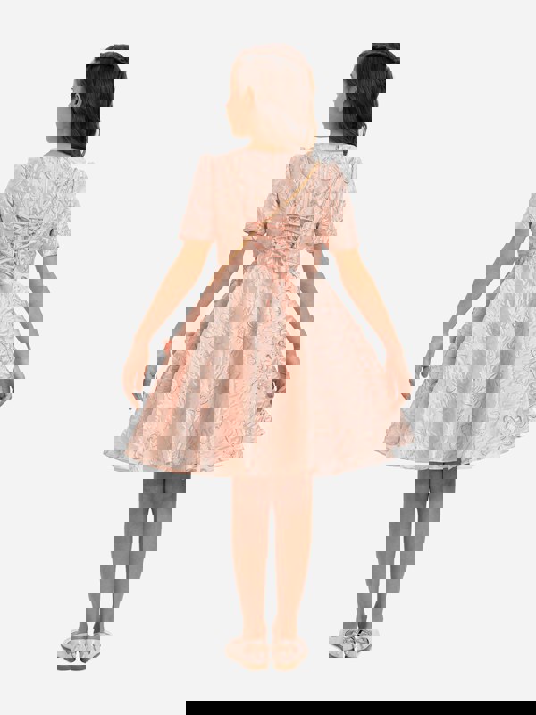 Made in luxurious jacquard fabric, the dress has a floral pattern with subtle shimmering details. Short puff sleeves and a tailored bodice shape the timeless silhouette, while a lace-up back completes the design. The main fabric is 100% polyester, with a 100% cotton lining.