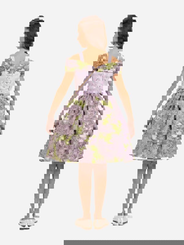 This girls jacquard dress and matching bag set comes in purple and includes a coordinating belt. The dress has an off-the-shoulder floral overlay with thin straps, creating a layered look across the neckline and shoulders. At the back, laced corset-style detailing adds a structured finish.
