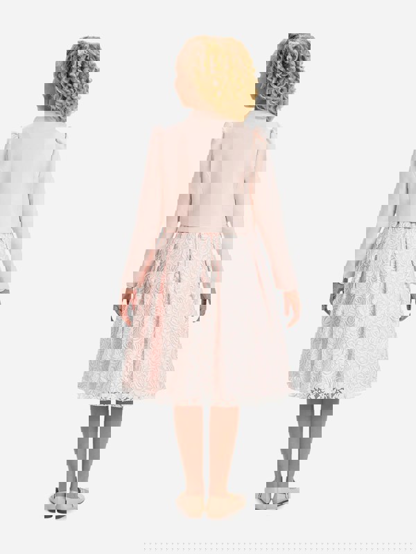 This Dress & Fleur girls set pairs a lace dress with a matching bolero in pink. The dress has a sleeveless cut and lace detailing, finished with a V-shaped back. An adjustable lace-up closure completes the look, while the lining is made from 100% cotton for a soft feel against the skin.