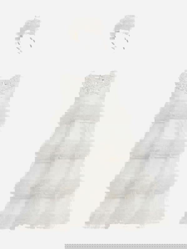 Intricate lace detailing and discreet beading add decorative finish to the dress, while the matching silk headband keeps the set consistent in colour and fabric.