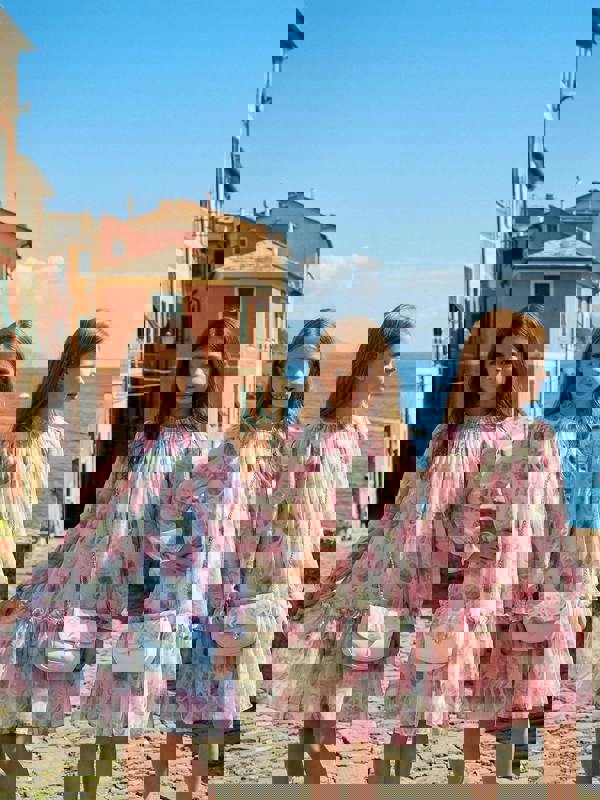 This girls occasion dress and bag set by Dress & Fleur comes in ivory for SS2026. The dress has a classic silhouette, paired with a coordinating bag for a complete two-piece set.