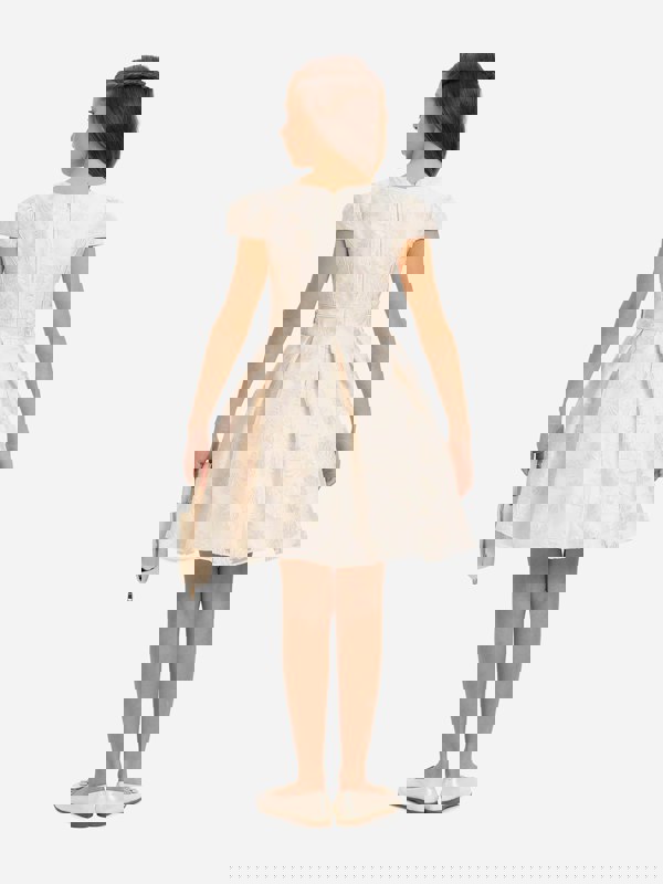 This girls dress and matching bag set from Dress & Fleur comes in beige and pairs traditional abstract influences with innovative materials. The dress has a round neckline and capped sleeves, finished with a flared, pleated skirt. Delicate floral embroidery and subtle shimmering details add texture and definition, while a belt detail with decorative buttons completes the look.