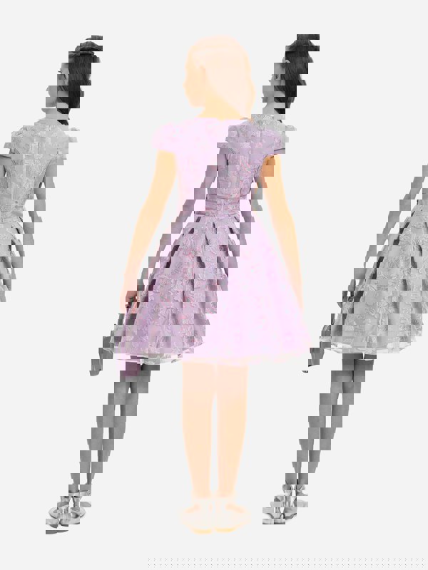 Dress & Fleur brings a refined look to occasionwear with this purple dress and matching bag set. The dress has a round neckline and capped sleeves, finished with a flared, pleated skirt. Delicate floral embroidery sits across the skirt, alongside subtle shimmering details for added texture.