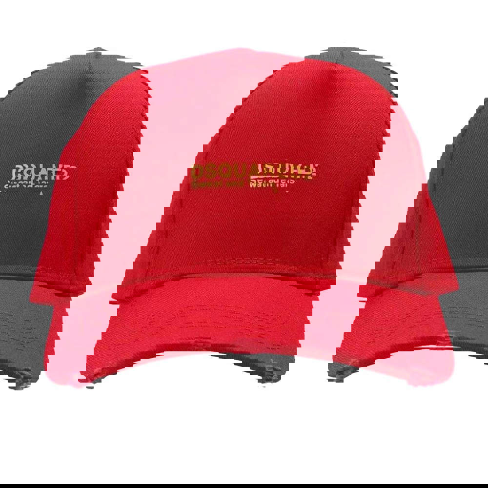 The DSquared2 Sweat And Tears Logo Baseball Cap in red features a classic 6 panel design with a curved brim for a traditional baseball-cap shape. Finished with a button at the top and embroidered eyelets, it offers considered detailing for everyday wear.