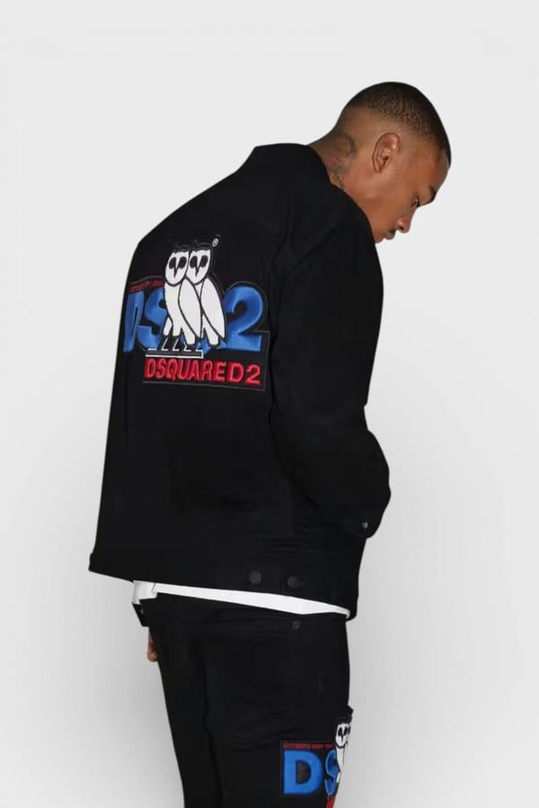 Elevate your denim game with this striking collaboration between Dsquared2 and OVO. Crafted from premium black denim, this jacket merges Italian tailoring precision with contemporary streetwear aesthetics. The structured silhouette flatters effortlessly, while quality construction ensures lasting wear. Perfect for layering over essentials or making a bold statement, this piece transitions seamlessly from casual to refined settings. A timeless investment that captures the essence of luxury streetwear.