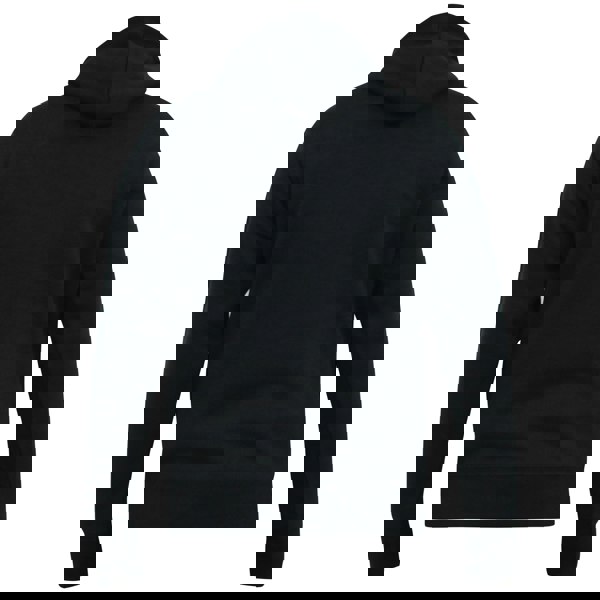 The black design includes a printed logo and text. Ribbed cuffs and a ribbed hem add structure, while a single kangaroo pocket provides a practical front detail. The fabric technology is listed as durable, and the garment is 100% officially licensed.