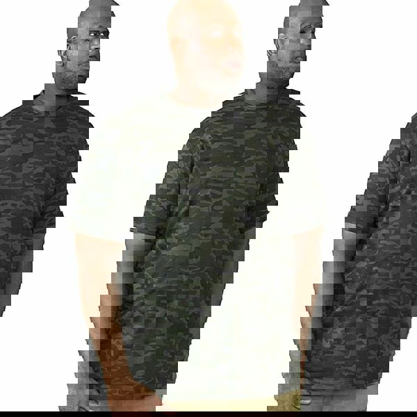 This short-sleeved T-shirt comes in a jungle camouflage design with a classic crew neckline. Made from 100% cotton, it has a soft-touch fabric finish and an easy-care construction for straightforward everyday wear. The kingsize fit offers a comfortable option for casual styling.