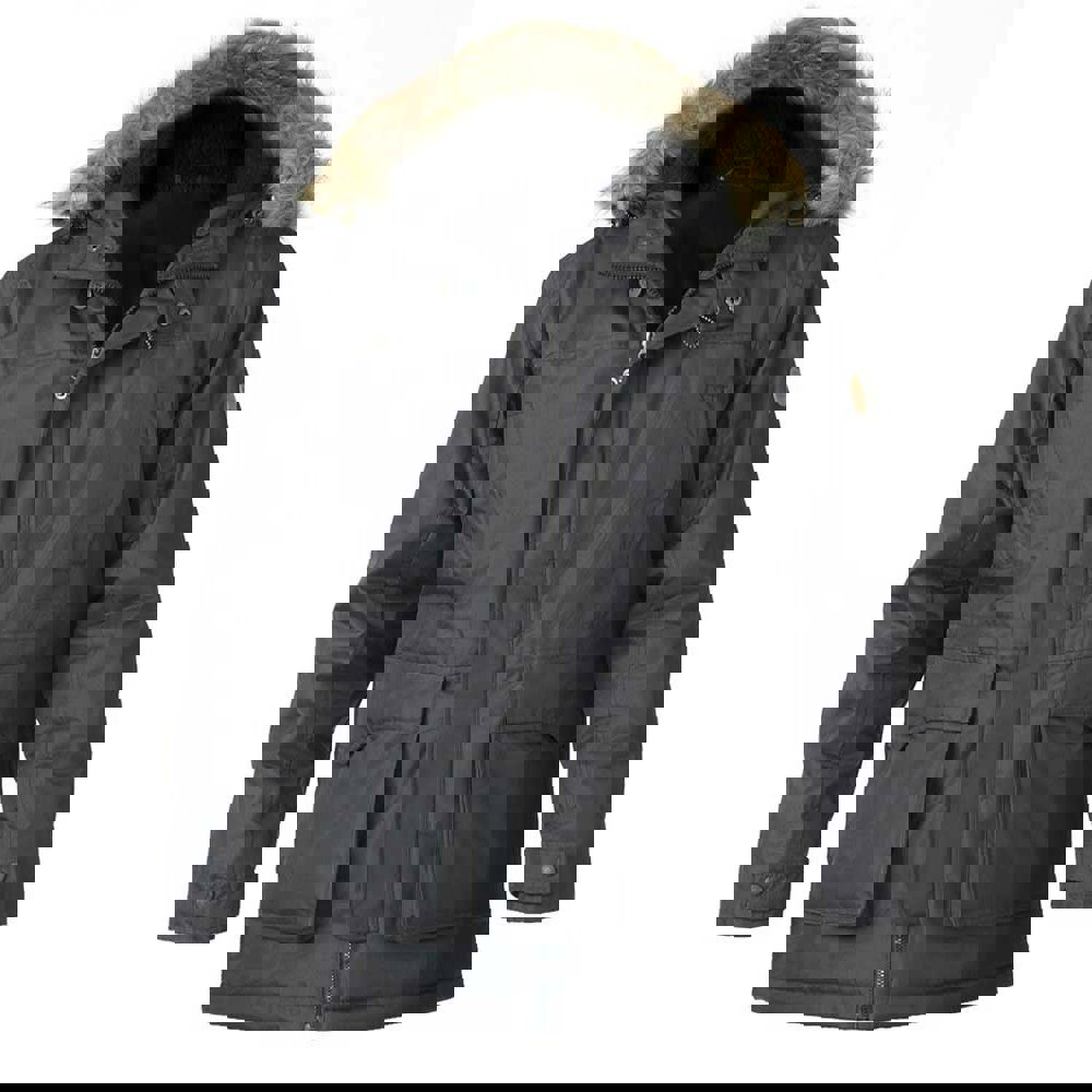 This men’s parka jacket is made from 100% polyester with a plain finish. It has a hooded neckline and long sleeves, with adjustable cuffs for a secure feel. The hood includes a detachable faux fur trim, allowing the look to be changed as needed.