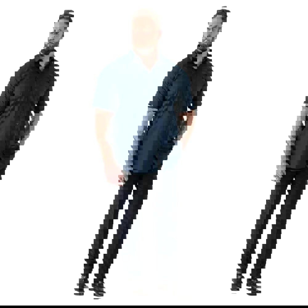 This short-sleeved shirt is made from a blend of 65% polyester, 32% cotton and 3% spandex, with 2 way stretch fabric. It comes in a plain navy finish for a clean, understated look.