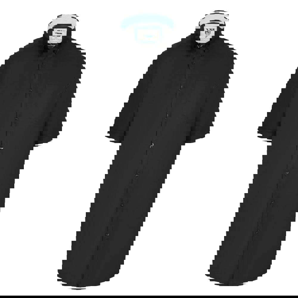 Duke Mens James D555 tall short-sleeved shirt in black. Made from a cotton and polyester blend in Oxford cloth, it has a plain design with a turn down collar. The tall fit and short sleeves give a clean, straightforward profile suited to everyday wear.