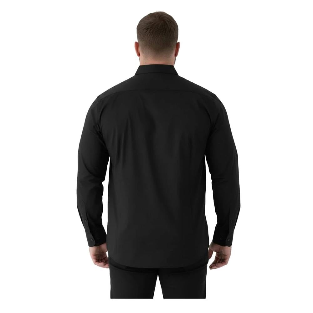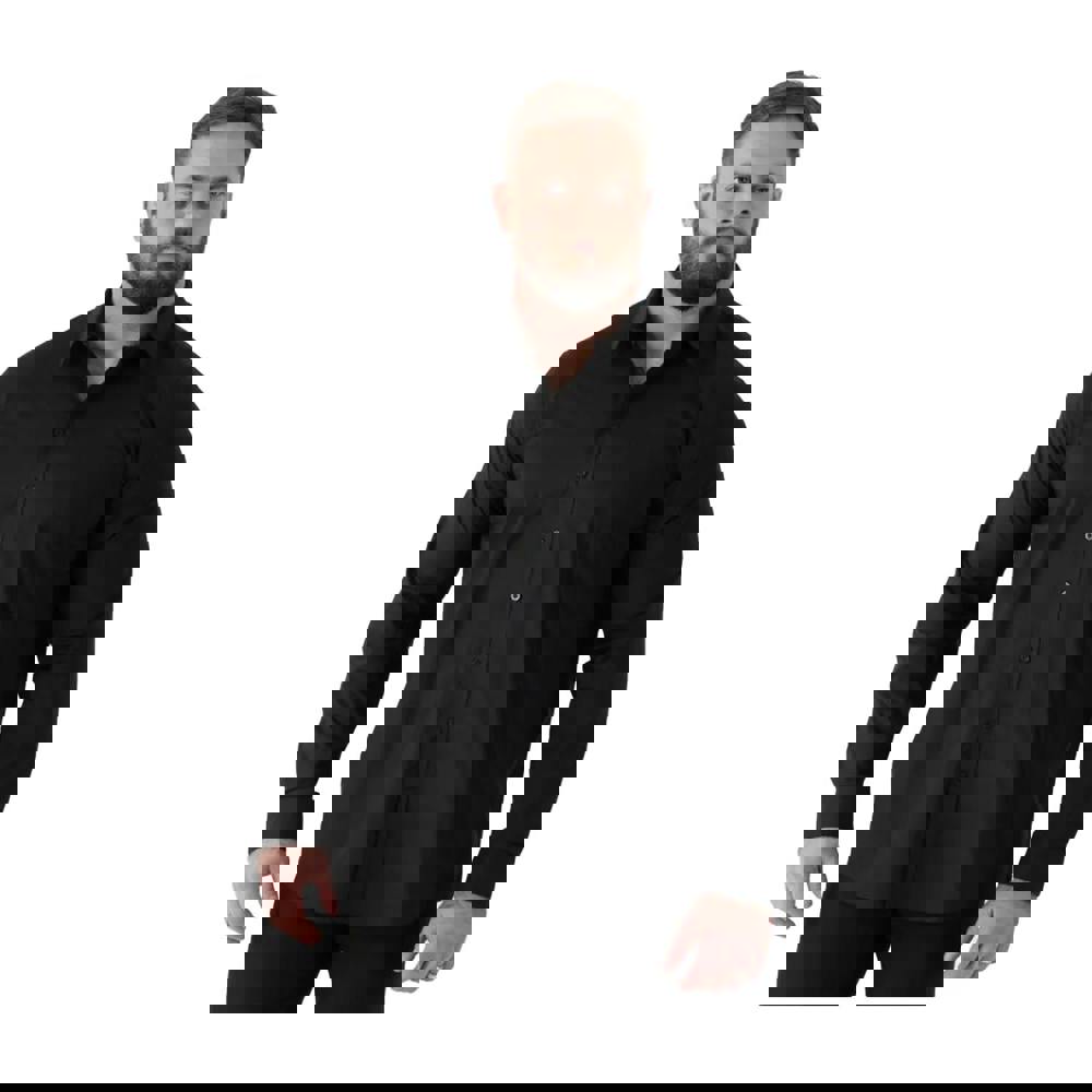 This long-sleeved stretch shirt comes in black with a plain finish and a turn down collar. Made from a polyester, cotton and spandex blend, it uses 2 way stretch fabric and a button-down fastening for a clean, structured look.