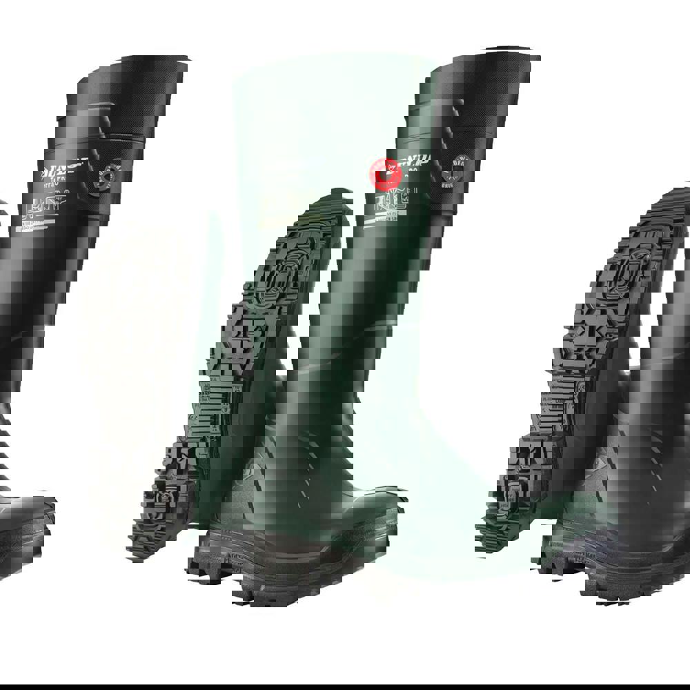 Dunlop TerraPRO Purofort Wellington boots in green offer a calf-length cut with a plain finish and logo detail. Built with Purofort fabric technology, they are abrasion resistant and durable, while keeping a flexible and lightweight feel. A round toe and low heel create a straightforward profile, suited to everyday wear where a slip-on boot is preferred.