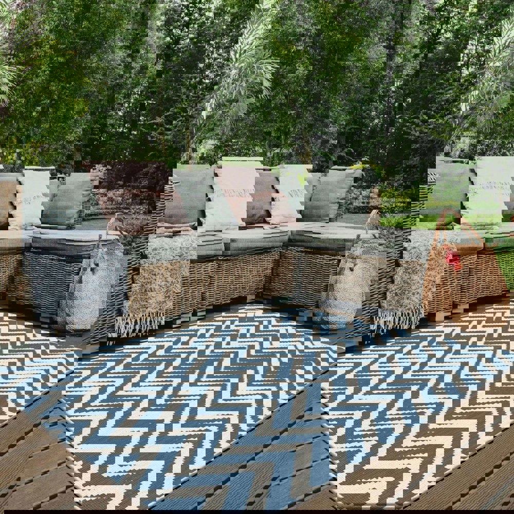 Enhance your indoor or outdoor area with the Duo Weave Outdoor Blue Rug Chevron. Featuring a subtle chevron motif, this rug brings contemporary style and durable performance to patios, living rooms, or high-traffic spaces.