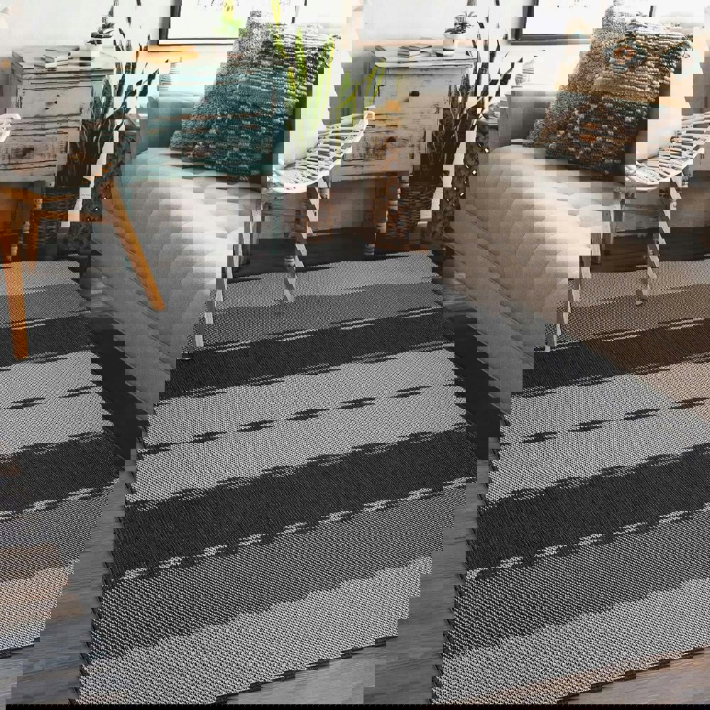 Refresh both indoor and outdoor areas with the Duo Weave Outdoor Rug in Dark Grey Stripes. Its striking striped pattern adds a contemporary, dynamic accent to patios, decks, or busy interior spaces, while durable construction ensures it withstands everyday wear.