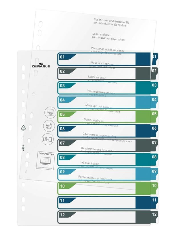 Durable tear-resistant file dividers with 12 numbered tabs for separating your documents numerically. The German designed index dividers use universal punching for maximum compatibility and includes a cover sheet for labelling.
