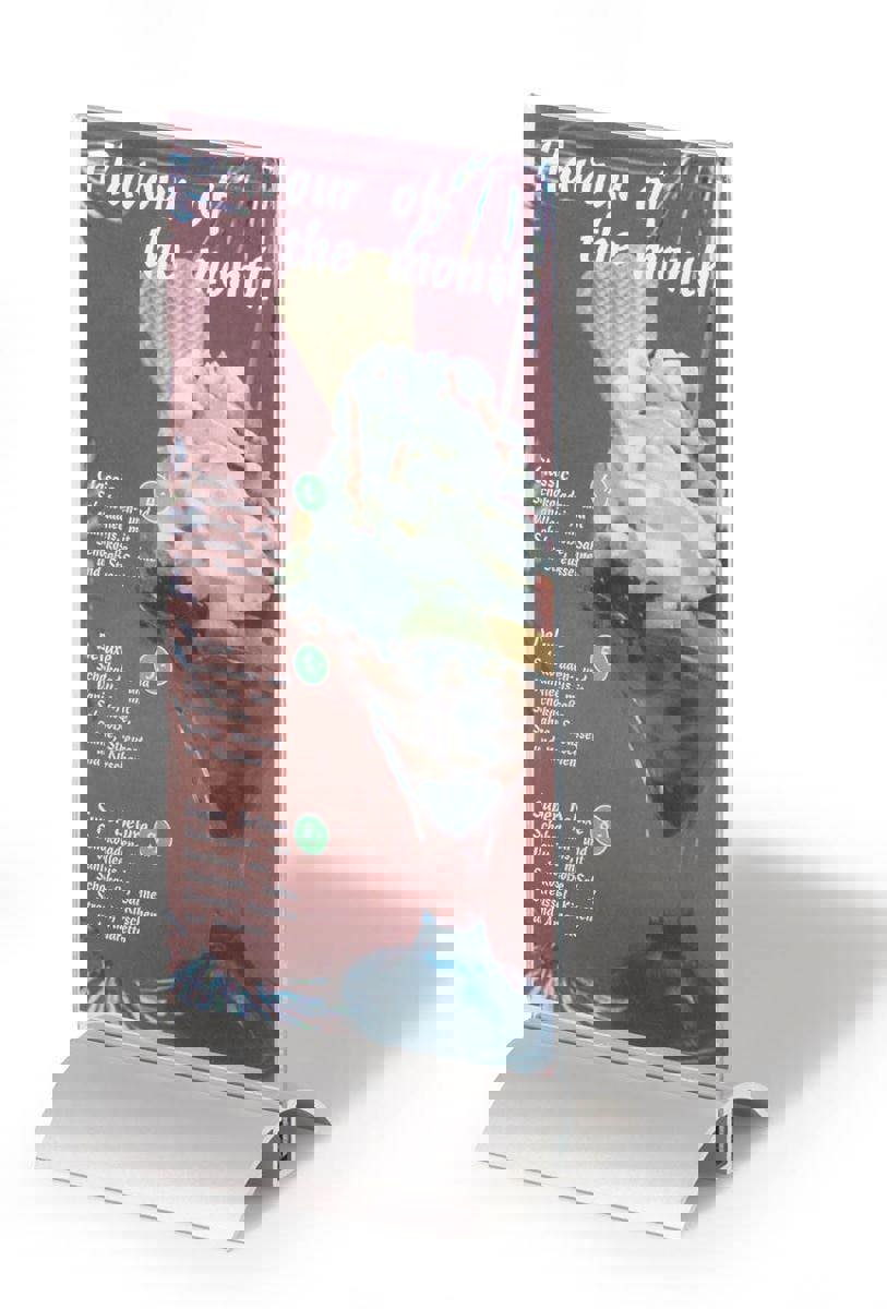 An elegant table sign perfect for professionally displaying information, menus, flyers etc. Strong crystal-clear acrylic panels ensure durability and readability and a machined aluminium base keeps the design stable.