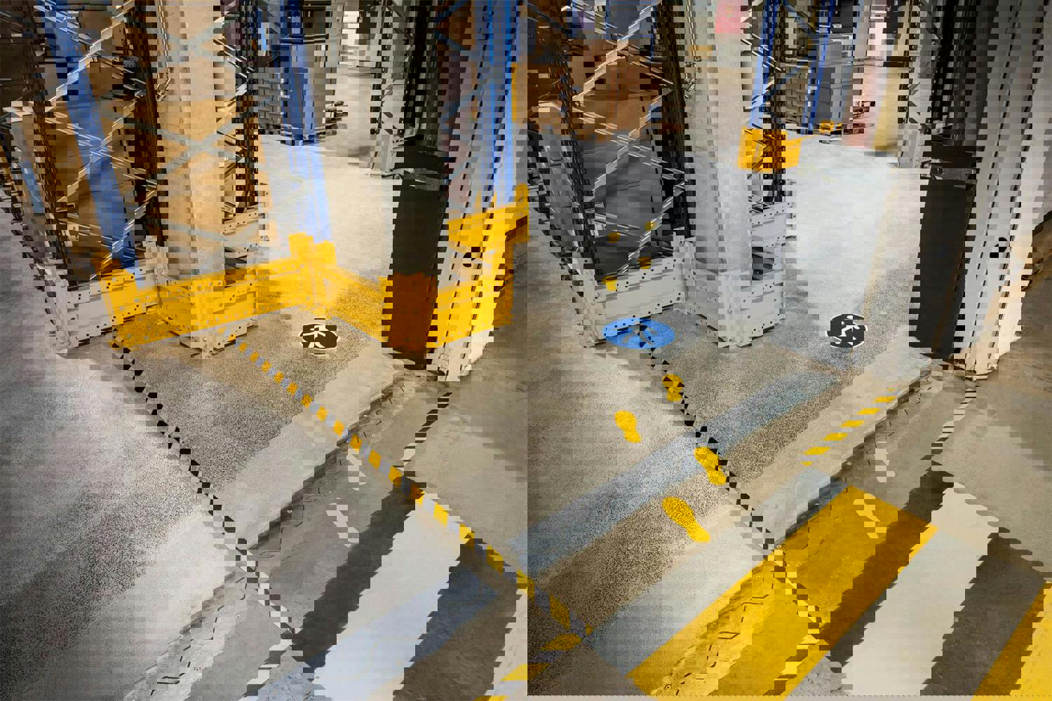 Permanent adhesive registered safety markings for application on floors in interior areas such as warehouses, distribution centres, production, etc