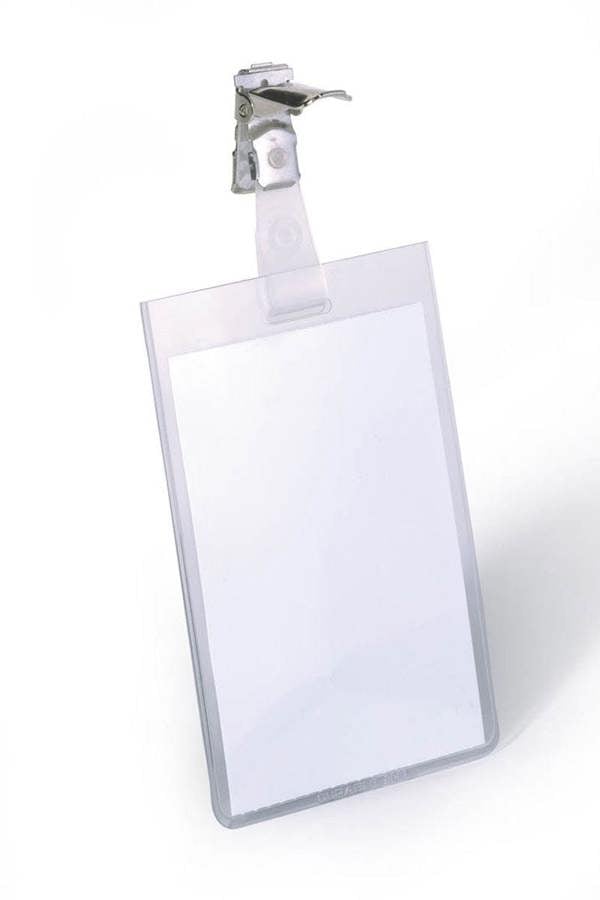 A transparent portrait hard PVC plastic name badge featuring rotating metal fastener to keep the badge sitting vertically. The clip cut-out allows combination with chain, badge reel or lanyards.