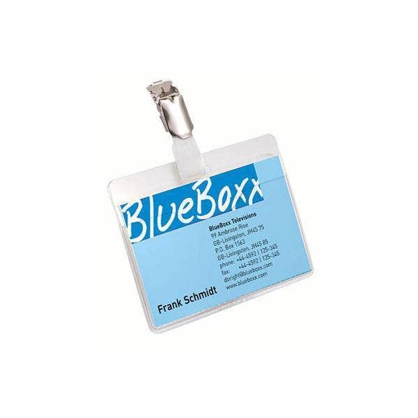 Transparent landscape hard PVC plastic name badges with an open cover for quickly changing inserts. They feature a rotating clip fastener to keep the badge sitting vertically and a clip cut-out for combination with chains, badge reels or lanyards.