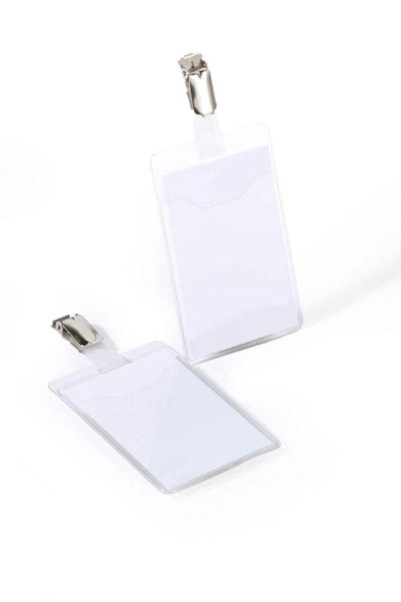 Transparent portrait hard PVC plastic name badges with a partial cover for quickly changing inserts. They feature a rotating clip fastener to keep the badge sitting vertically and a clip cut-out for combination with chains, badge reels and lanyards.