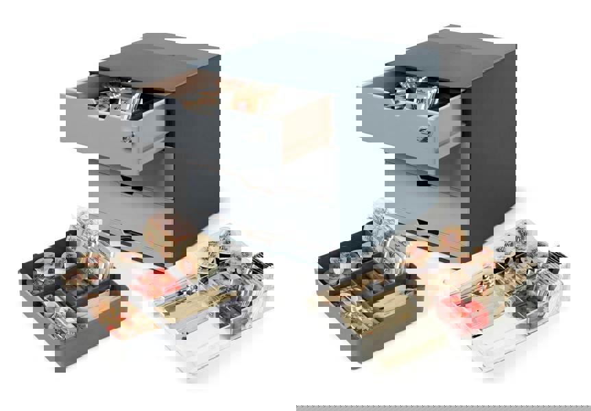 The Durable COFFEE POINT 4-Drawer Storage Box is a flexible and secure solution for organising hospitality supplies in shared spaces. With deep drawers and integrated organisers, it's perfect for storing coffee pods, tea bags, sugar sachets, stirrers, and more.