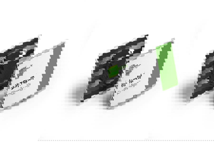 A crystal clear frameless name badge made of solid acrylic with an unpretentious, prestigious design for use in banks, hotels, hospitality and trade fairs.