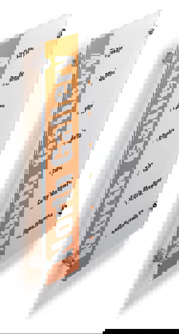 An elegant modern door sign made of brushed steel and crystal clear acrylic plates. The floating appearance is achieved through the use of the included semi-transparent inserts, compatible with all commonly available ink-jet and laser printers.