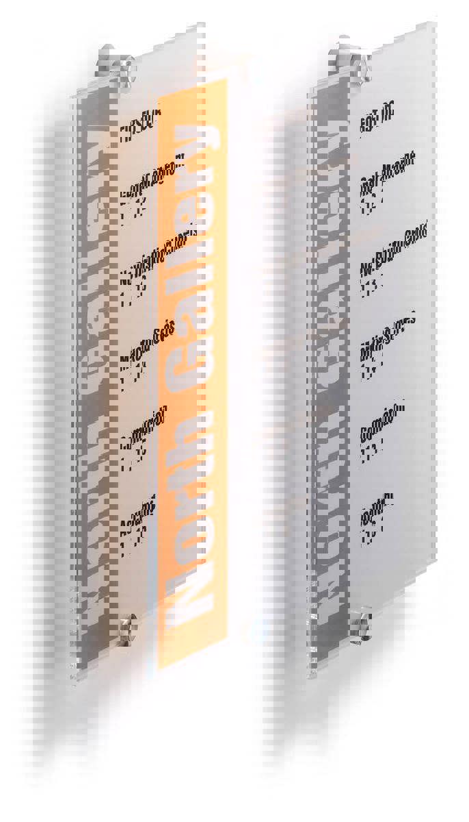 An elegant modern door sign made of brushed steel and crystal clear acrylic plates. The floating appearance is achieved through the use of the included semi-transparent inserts, compatible with all commonly available ink-jet and laser printers.