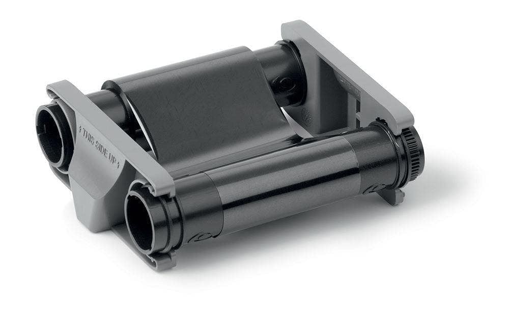 Black ribbon for printing 500 high resolution monochrome plastic cards. A transparent protective coating provides the cards with an additional seal for durability and water resistance.